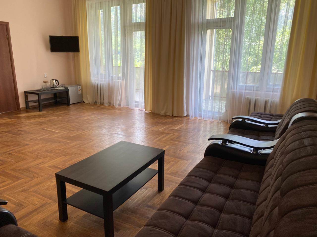 Отличительной особенностью данной категории является зона гостиной, оборудованная удобными креслами, диваном и журнальным столиком. С видом на горы или горы и реку