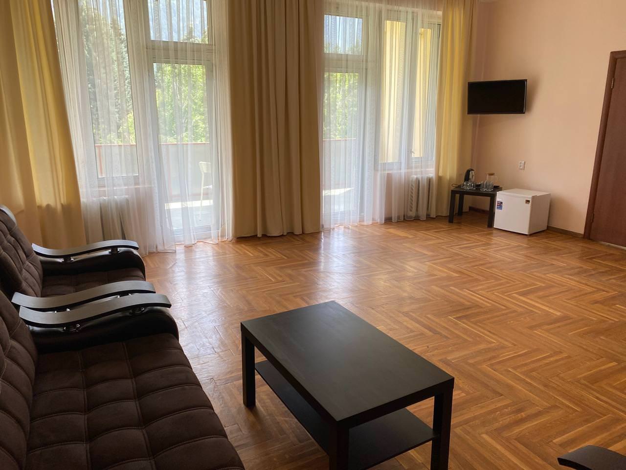 Люкс 2-х местный, можно + 2 доп. места (балкон, чайник и чайные принадлежности, графин, стаканы, шкаф, кровать, прикроватные тумбочки, комод, зеркало, мягкая мебель, холодильник, тв плазменный, сан узел, душевая, шампунь, мыло, фен).
